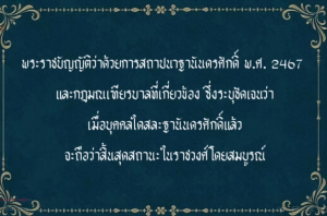 ฐานันดรศักดิ์ พ.ศ. 2467 และ กฎ มวล เทียนบาล ที่ เกี่ยว ข้อง ซึ่ง ระบุ ชัด เจน ว่า เมื่อ บุคคล ใด สละ ฐานันดรศักดิ์ แล้ว จะ ถือ ว่า สิ้น สุด สถานะ ใน ราชวงศ์ โดย สมบูรณ์ กฎ หมาย ดัง กล่าว มี ที่ มา จาก การ ปรับ ปรุง ระบบ ราชการ ใน สมัย รัชกาล ที่ 6 เพื่อ ให้ มี ความ ชัด เจน ใน เรื่อง สถานะ และ สิทธิ ต่าง ๆ ภาย ใน ราชวงศ์ การ สละ ฐานันดศักดิ์ จึง ไม่ ใช่ เพียง การ เปลี่ยน แปลง ชื่อ เรียก หรือ ตำแหน่ง แต่ เป็น การ สละ สิทธิ์ และ หน้า ที่ ทั้ง หมด ที่ เกี่ยว ข้อง กับ การ เป็น สมาชิก ราชวงศ์ ใน กรณี ของ ท่าน การ สละ ฐานันดรศักดิ์