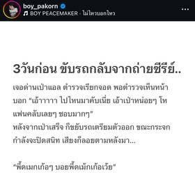 โดย บอยเล่าว่า “3วันก่อน ขับรถกลับจากถ่ายชีรีย์..เจอด่านเป่าแอลฯ ตำรวจเรียกจอด พอตำรวจเห็นหน้า บอก “เอ้าาาาา ไปไหนมาคับเนี่ย เอ้าเป่าหน่อยๆ โห แฟนคลับเลยๆ ชอบมากๆ” หลังจากเป่าเสร็จ ก็ขยับรถเตรียมตัวออก ขณะกระจกกำลังจะปิดสนิท เสียงก็ลอยตามหลังมา…“พื้ดเมกเก้อๆ บอยพี้ดเม้กเก้อเว้ย” ได้แต่พึมพำกับตัวเอง กรูยังไหว…
