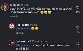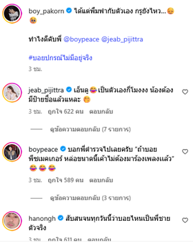 โดยทางด้าน บอย เเละ เจี๊ยบ ได้เข้ามาคอมเมนต์ว่า เอ็นดูเป็นตัวเองกี่โมงงง น้องต้องมีป้ายชื่อแล้วแหละ,บอกพี่ตำรวจไปเลยครับ ถ้าบอย พีซเมคเกอร์ หล่อขนาดนี้เค้าไม่ต้องมาร้องเพลงเเล้ว ท่ามกลางคนในวงการต่างเข้ามาคอมเมนต์แซวกันอย่างมาก